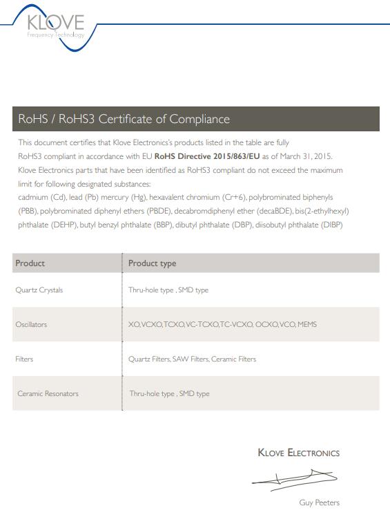 該表格證明列出的Klove Electronics產(chǎn)品完全符合歐盟RoHS指令2015/863/EU的要求(限制在電氣和電子設備中使用某些有害物質- RoHS3)。