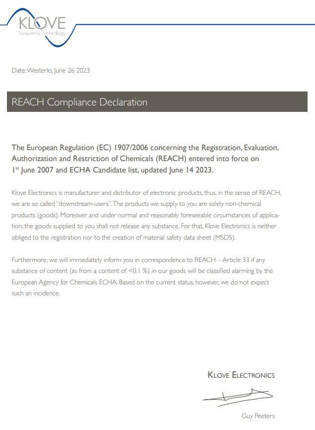 Klove Electronics是電子產(chǎn)品的制造商和經(jīng)銷商,因此,在REACH的意義上,我們被稱為“下游用戶”。我們向您提供的產(chǎn)品僅為非化工產(chǎn)品(商品)。此外,在正常和可合理預見的應用環(huán)境下,提供給貴方的貨物不應釋放任何物質。為此,Klove Electronics既沒有義務進行注冊,也沒有義務創(chuàng)建材料安全數(shù)據(jù)表(MSDS)。