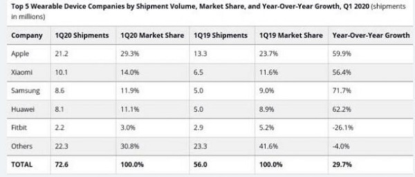 據(jù)外媒報(bào)道,市場研究機(jī)構(gòu)IDC日前發(fā)布全球可穿戴設(shè)備季度跟蹤報(bào)告的最新數(shù)據(jù),顯示全球可穿戴設(shè)備出貨量在2020年第一季度達(dá)到7260萬部,同比增長29.7%.其中,蘋果仍然遙遙領(lǐng)先,可穿戴設(shè)備獨(dú)占近三成市場份額.