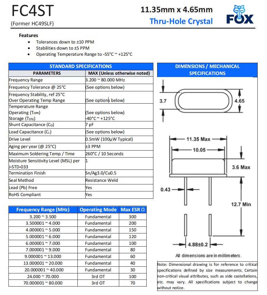 FC4STCBMF14.7456 | Fox 晶振 | C4ST | 14.7456 MHz | ±50ppm | ±30ppm | 20pF | -20°C ~ 70°C |