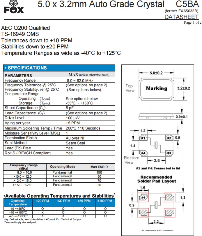 FC5BACBEI26.0-T1 | Fox 晶振 | C5BA | 26 MHz | ±50ppm | ±30ppm | 10pF | -40°C ~ 125°C |