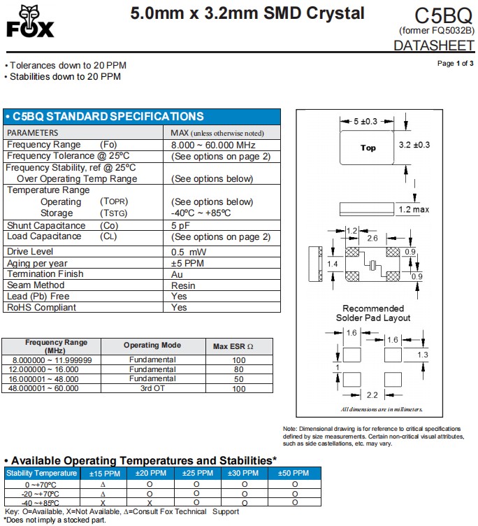 FC5BQCCMC48.0-T1 | Fox 晶振 | C5BQ | 48 MHz | ±30ppm | ±30ppm | 20pF | 0°C ~ 70°C |