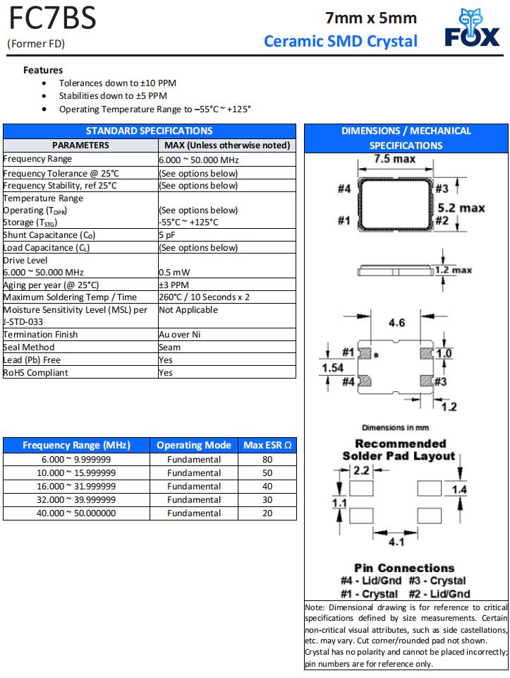 FC7BSCCMC10.0-T1,7050mm無源晶振,FOX晶體諧振器,智能家居晶振,規(guī)格表