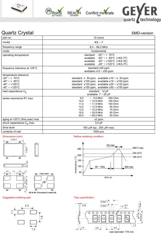 GEYER格耶晶振,KX-7高精度晶振,3225無源晶體,3225mm體積貼片晶振適用于汽車電子領(lǐng)域的表面貼片型石英晶振,本產(chǎn)品已被確定的高信賴性最適合用于汽車電子部件,晶體在極端嚴(yán)酷的環(huán)境條件下也能發(fā)揮穩(wěn)定的起振特性,晶振本身具有耐熱,耐振,耐沖擊等優(yōu)良的耐環(huán)境特性,滿足無鉛焊接的高溫回流溫度曲線要求,符合AEC-Q200標(biāo)準(zhǔn).