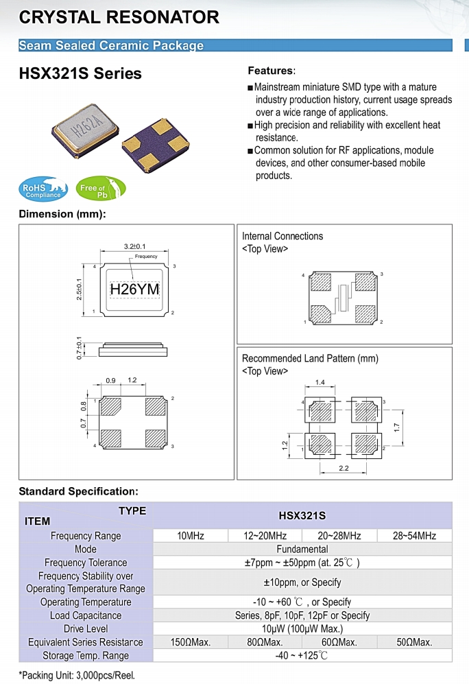 X3S010000BK1H-U | HELE晶振 | HSX321S | 10.000MHZ | 20PF | ±10PPM | ±10PPM |