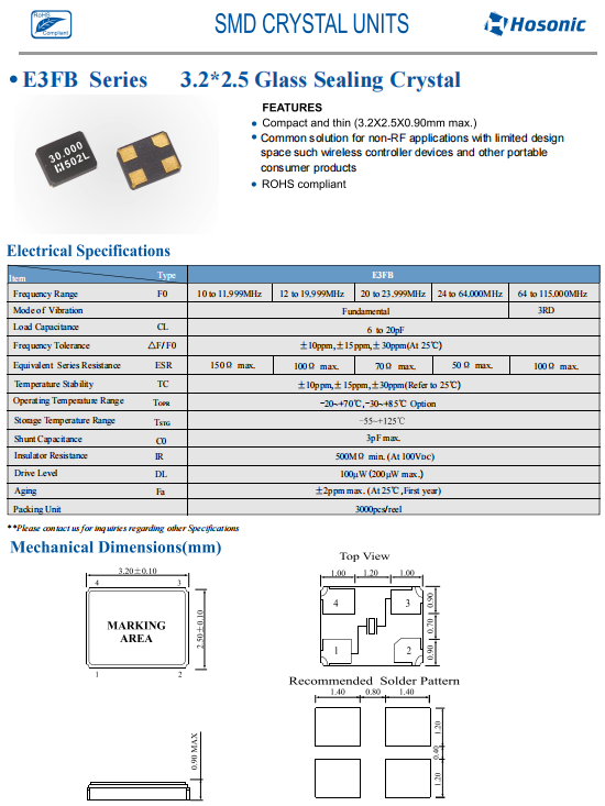 E3FB16.0000F18E33 | Hosonic晶振 | E3FB | 16MHz | 18pF | ±30ppm | ±30ppm | 3.2 x 2.5 x 0.8 mm |