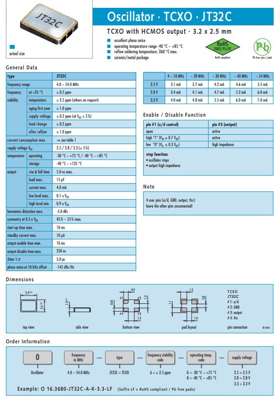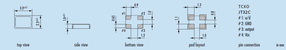JUACH晶振,JT32C晶振,3225溫補(bǔ)晶振體積的溫補(bǔ)晶振(TCXO),是目前有源晶振中體積最小的一款,產(chǎn)品本身帶溫度補(bǔ)償作用的晶體振蕩器,該體積產(chǎn)品最適合于GPS,以及衛(wèi)星通訊系統(tǒng),智能電話等多用途的高穩(wěn)定的頻率溫度特性晶振.為對應(yīng)低電源電壓的產(chǎn)品.(DC+1.8V ± 0.1V to +2.9V ± 0.1V 對應(yīng)IC可能) 高度:最高0.8 mm,體積:0.0022 cm3,重量:0.008 g,超小型,輕型.低消耗電流,表面貼片型產(chǎn)品.(可對應(yīng)回流焊)無鉛產(chǎn)品.滿足無鉛焊接的高溫回流溫度曲線要求,帶有AFC(頻率控制)功能,Enable/Disable功能,產(chǎn)品本身可根據(jù)使用需要進(jìn)行選擇.
