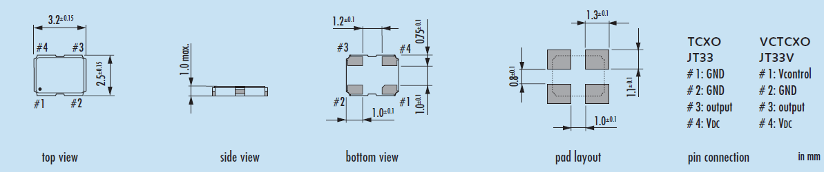 Jauch晶振,JT33,JT33V晶振,3225溫補(bǔ)晶振具有最適合于移動通信設(shè)備用途的高穩(wěn)定的頻率溫度特性.為對應(yīng)低電源電壓的產(chǎn)品.(可對應(yīng)DC +1.8 V±0.1 V to +3.2 V±0.1 V )高度:最高1.0 mm,體積:0.007 cm3,重量:0.024g,超小型,輕型.低消耗電流,表面貼片型產(chǎn)品.(可對應(yīng)回流焊) 無鉛產(chǎn)品.滿足無鉛焊接的回流溫度曲線要求.