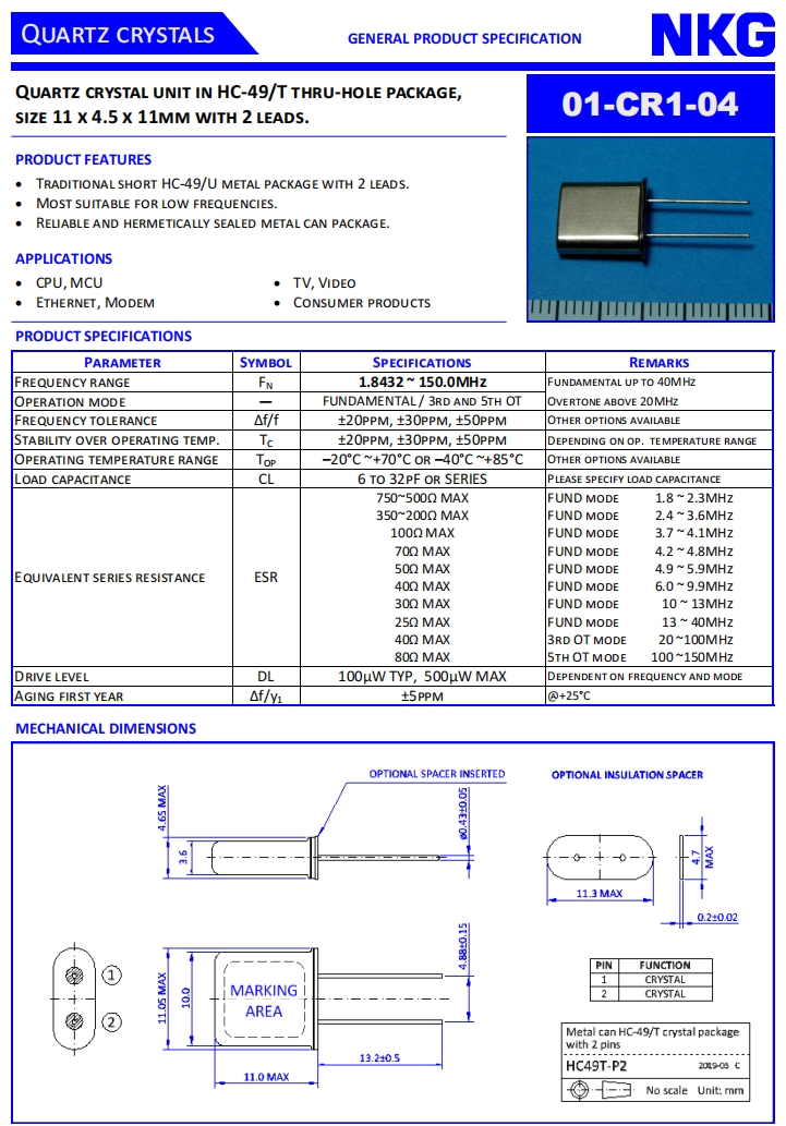 NKG晶振|01-CR1-04-25M000-T20-2030M-EXT|HC-49U插件晶振,香港晶振品牌,NKG晶振,01-CR3-04進口晶振,HC-49U插件晶振,01-CR1-04-25M000-T20-2030M-EXT晶振,石英晶體諧振器,無源晶振,11x4.5x11mm晶振,頻率25MHz,負載20pF,工作溫度-40~85°C,頻率容差20pm,高質(zhì)量晶振,高精度晶振,低老化晶振,調(diào)制解調(diào)器晶振,消費類電子產(chǎn)品晶振,CPU晶振,家用電視機頂盒晶振.
