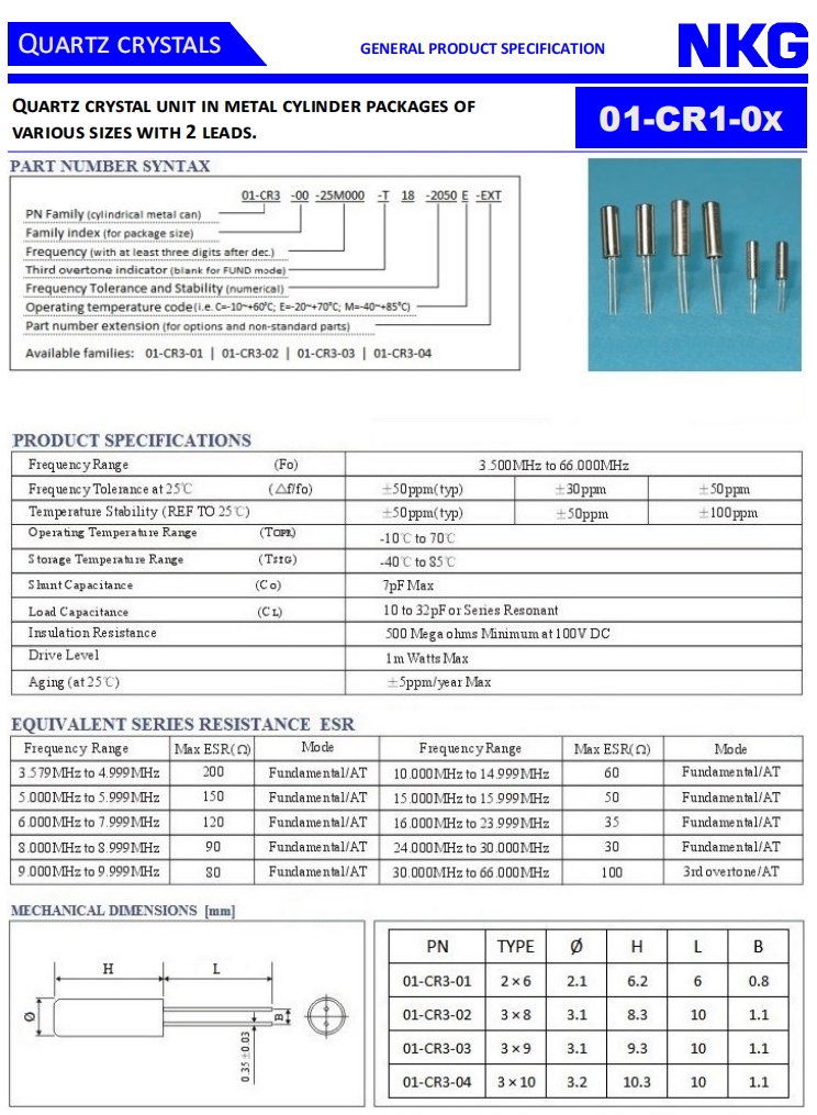 NKG晶振|01-CR3-02-11M288-T16-2050E-EXT|3×8圓柱晶振規(guī)格表