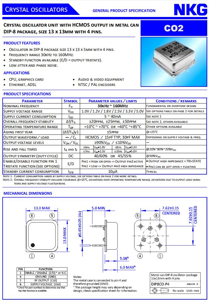 NKG Crystal|CO2-5-B-10.2400-WNS-EXT|正方形鐘振,NKG晶振,CO2正方形鐘振,進口有源晶振,CO2-5-B-10.2400-WNS-EXT晶振,石英振蕩器,四腳插件晶振,13 x 13 x 5mm四腳插件封裝,支持待機功能,頻率10.24MHz,電壓3.3V,負載15pF,工作溫度-40~85°C,頻率穩(wěn)定性50ppm,低抖動晶振,高品質晶振,抗震動晶振,專業(yè)視頻設備晶振,以太網晶振,CPU顯卡晶振,PAL編碼器晶振.