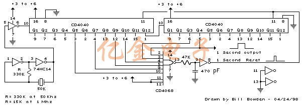 使用50Khz晶振時(shí),當(dāng)加起來50000的相應(yīng)計(jì)數(shù)器位全部為高時(shí),檢測(cè)到50000的計(jì)數(shù).這對(duì)應(yīng)于位15(32768)+14(16384)+9(512)+8(256)+6(64)+4(16).位14和15是第二計(jì)數(shù)器的第3和第4級(jí),位0是第一計(jì)數(shù)器(Q1,引腳9)的第一級(jí).要使用100Khz晶體,每個(gè)位將向右移動(dòng)一次,因此總數(shù)將為(65536+32768+1024+512+128+32=100,000).使用1Mhz晶體,需要以下位: 在1Mhz時(shí),有源晶體振蕩器電路中的330K電阻需要按比例減小到大約15K.當(dāng)達(dá)到終端計(jì)數(shù)時(shí),在NAND門之后的施密特觸發(fā)器反相器級(jí)產(chǎn)生7μS復(fù)位脈沖.47K電阻和470皮法電容維持輸出,使計(jì)數(shù)器可靠地復(fù)位為零.這在50Khz時(shí)不到一個(gè)時(shí)鐘周期,并且不會(huì)引入錯(cuò)誤,但在1MHz時(shí)會(huì)達(dá)到7個(gè)周期,這將導(dǎo)致計(jì)數(shù)器每秒丟失7微秒的時(shí)間.這不是一個(gè)錯(cuò)誤(百萬分之七),但它會(huì)存在.4040 CMOS計(jì)數(shù)器的最小復(fù)位脈沖寬度約為1.5uS,因此復(fù)位脈沖不能短得多.