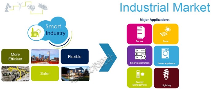 針對(duì)工業(yè)4.0的功率器件總體上包括高電壓功率MOSFET、低電壓功率MOSFET、IGBT、碳化硅MOSFET、氮化鎵、功率RF、功率模塊等覆蓋相對(duì)較廣的各種產(chǎn)品.