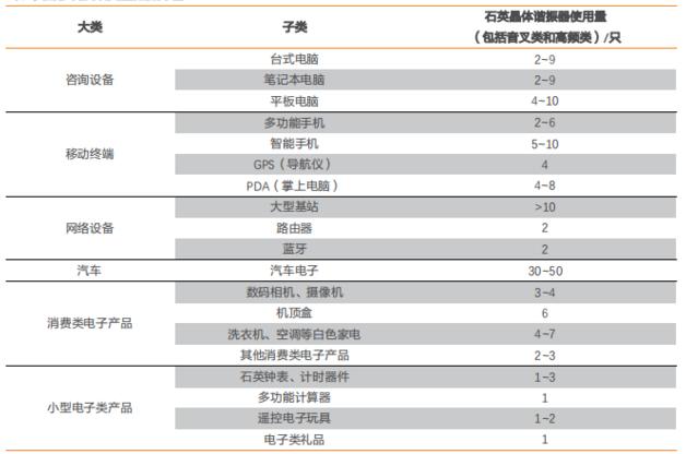 石英晶體諧振器廣泛應(yīng)用于工業(yè)、民用和軍事等電子產(chǎn)品領(lǐng)域,部分應(yīng)用終端對石英晶體諧振器需求量如下表所列: