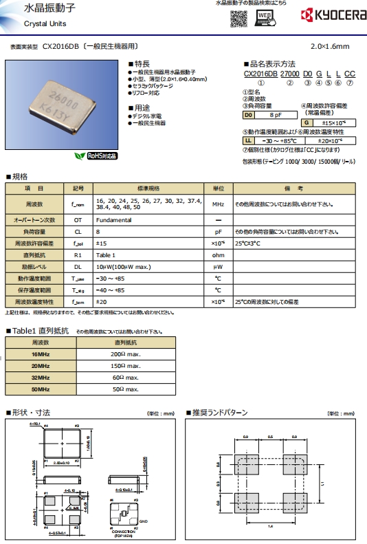 CX2016DB19200H0KFQC1 | AVX Corp/Kyocera Corp | CX2016DB, Kyocera | MHz Crystal | 19.2MHz |