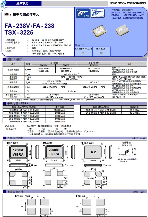 日本進口愛普生晶振FA-238V是一款小體積晶振尺寸3.2x2.5mm四腳貼片晶振,無源晶振,石英晶體諧振器,F(xiàn)A-238V頻率范圍12MHz至15.9999MHz之間,可以在-40℃至+85℃(+105℃)溫度內(nèi)穩(wěn)定工作,該產(chǎn)品具有小體積輕薄型,耐熱、耐振、耐沖擊等優(yōu)良的耐環(huán)境特性,被廣泛用于移動通訊,智能手機,平板電腦,汽車電子,移動電話,無線藍牙,ISM頻段電臺廣播,MPU時鐘等.