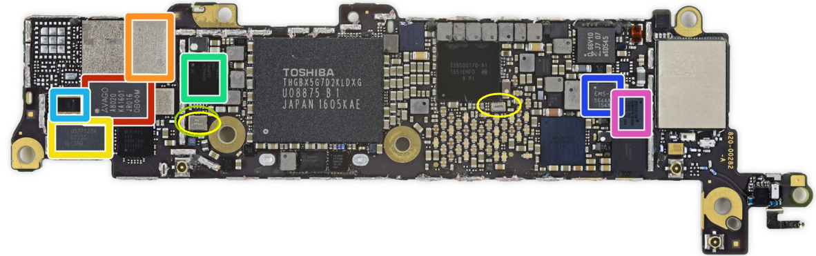 (如下圖) 橙色:Quorvo TQF6410低頻段功率放大器雙工器(和iPhone 6 Plus中的一樣);紅色:Avago ACPM-8020中頻段功率放大器雙工器(和iPhone 6 Plus中的一樣); 青色:Quorvo RF5159天線開(kāi)關(guān)模塊(和iPhone 6/6 Plus中的一樣);黃色:TDK EPCOS D5255接收模塊; 綠色:高通PM8019 PMIC(和iPhone 6/6 Plus一樣); 紫色:Broadcom BCM5976觸摸屏控制器(和iPhone 5中的一樣).藍(lán)色:InvenSense EMS-A六軸陀螺儀和加速度計(jì)組合;