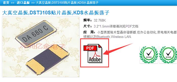 第四步,點(diǎn)擊之后會(huì)跳轉(zhuǎn)到DST310S石英晶振產(chǎn)品詳細(xì)頁面,從介紹中我們可以看到頻率,尺寸和應(yīng)用,從尺寸中我們可以看到是符合要求的3.2*1.5mm,這時(shí)我們大致可以確認(rèn)客戶要找的就是這顆料,為了更利于客戶選定產(chǎn)品我們官網(wǎng)上的每一個(gè)晶振產(chǎn)品都有放上PDF規(guī)格書,我們可以免費(fèi)下載了解更多詳細(xì)參數(shù).