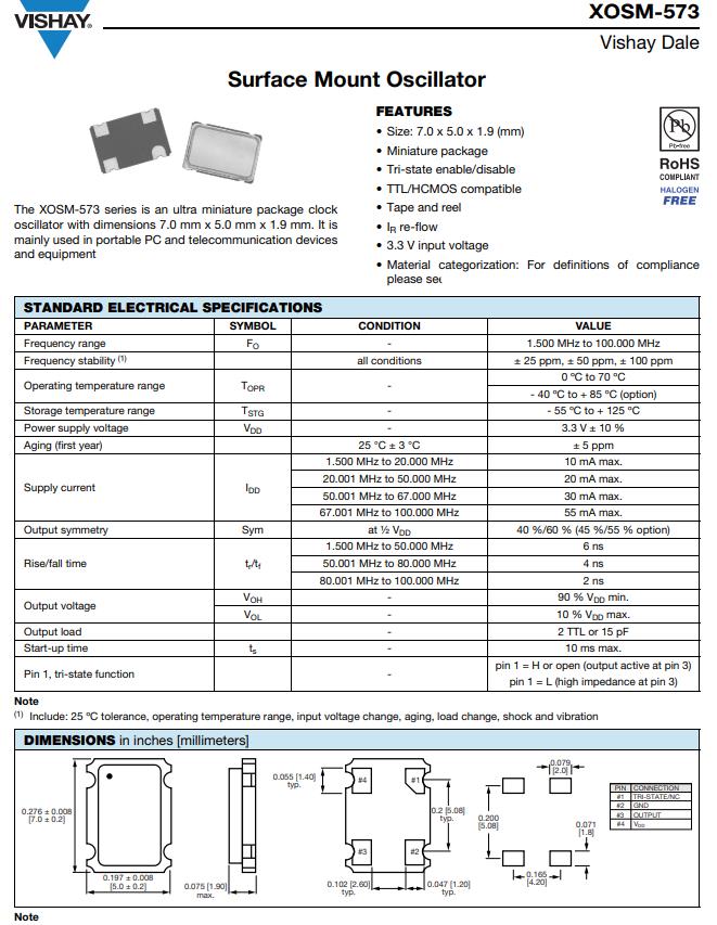Vishay公司發(fā)布編碼XOSM-573-B-E-40M,型號(hào)XOSM-573,頻率為40.000MHz,電壓3.3V,工作溫度0°Cto70°C,XOSM-573系列是一款超小型封裝時(shí)鐘振蕩器,SMD振蕩器,它是主要用于便攜式PC機(jī)和電信設(shè)備和設(shè)備,產(chǎn)品具備高質(zhì)量低抖動(dòng)低電壓低相位的特點(diǎn),產(chǎn)品主要特點(diǎn):尺寸:7.0 x 5.0 x 1.9 (mm),微型包裝,三狀態(tài)啟用/禁用,TTL/HCMOS兼容,磁帶和卷軸,IR再流動(dòng),3.3 V輸入電壓,材料分類:用于符合性定義.